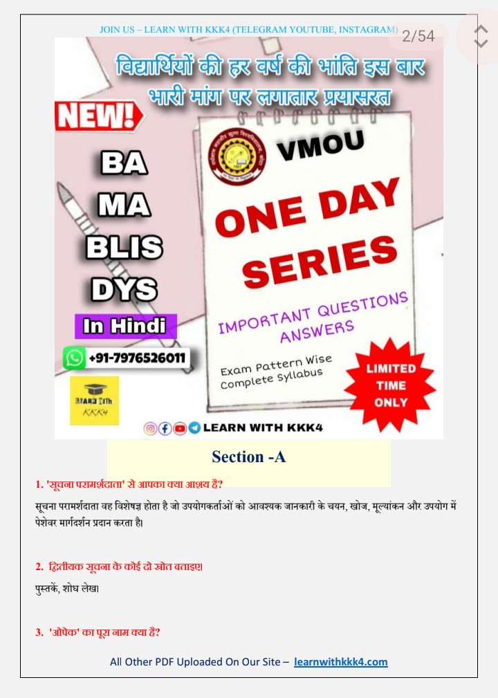 VMOU (Vardhman Mahaveer Open University, Kota) student looking for reliable and effective most important questions for exam paper ? Your search ends here! (LEARN WITH KKK4) presents a comprehensive University one day series PDF specifically designed for VMOU courses. This PDF is the perfect resource to help you excel in your studies and submit top-notch assignments