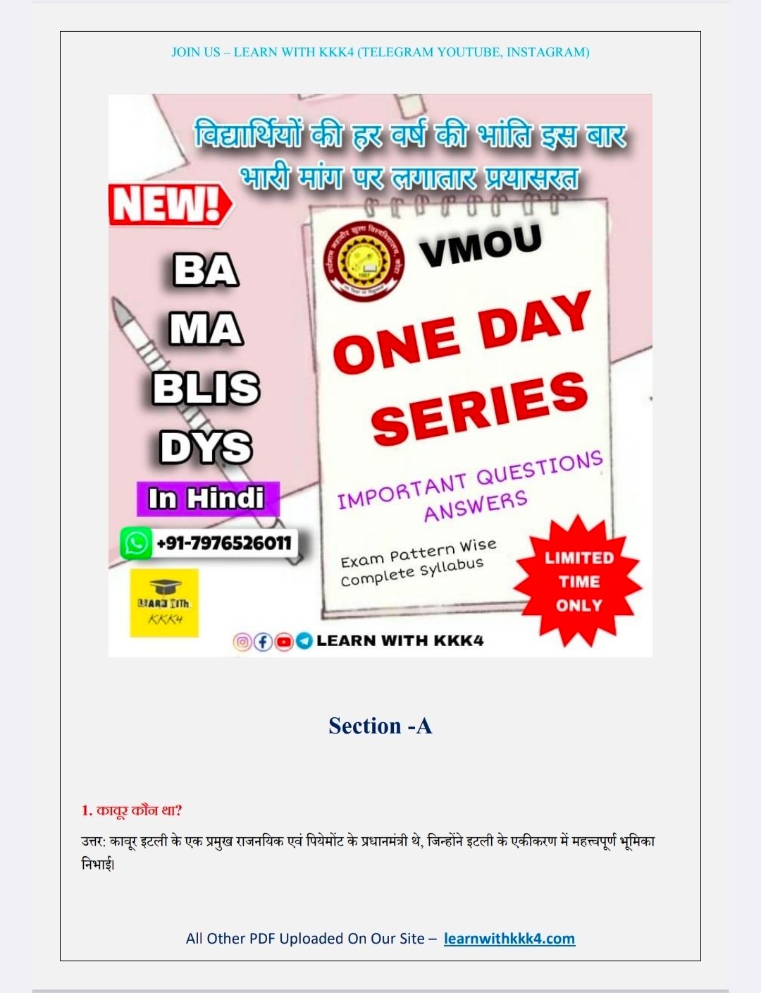 VMOU (Vardhman Mahaveer Open University, Kota) student looking for reliable and effective most important questions for exam paper ? Your search ends here! (LEARN WITH KKK4) presents a comprehensive University one day series PDF specifically designed for VMOU courses. This PDF is the perfect resource to help you excel in your studies and submit top-notch assignments