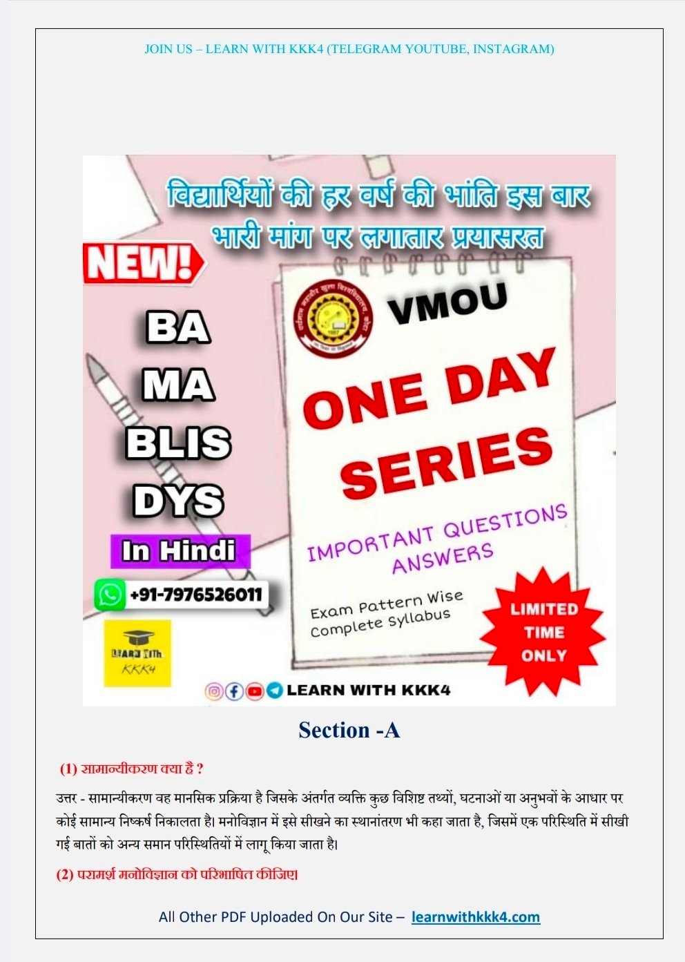 VMOU (Vardhman Mahaveer Open University, Kota) student looking for reliable and effective most important questions for exam paper ? Your search ends here! (LEARN WITH KKK4) presents a comprehensive University one day series PDF specifically designed for VMOU courses. This PDF is the perfect resource to help you excel in your studies and submit top-notch assignments