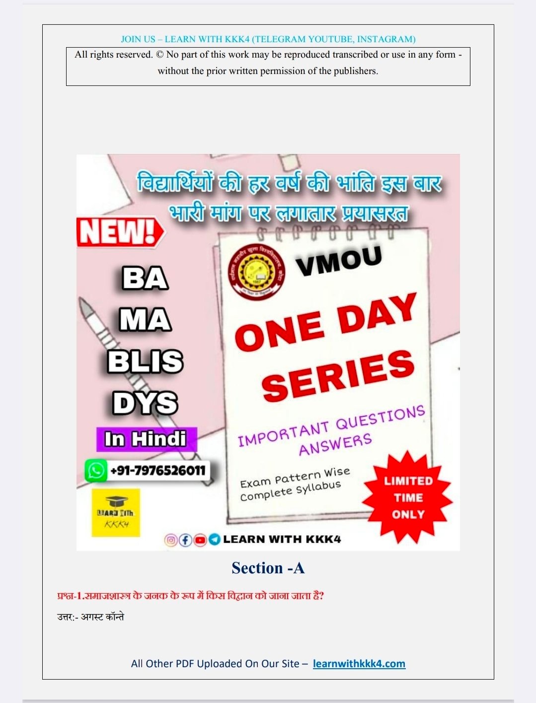 VMOU (Vardhman Mahaveer Open University, Kota) student looking for reliable and effective most important questions for exam paper ? Your search ends here! (LEARN WITH KKK4) presents a comprehensive University one day series PDF specifically designed for VMOU courses. This PDF is the perfect resource to help you excel in your studies and submit top-notch assignments