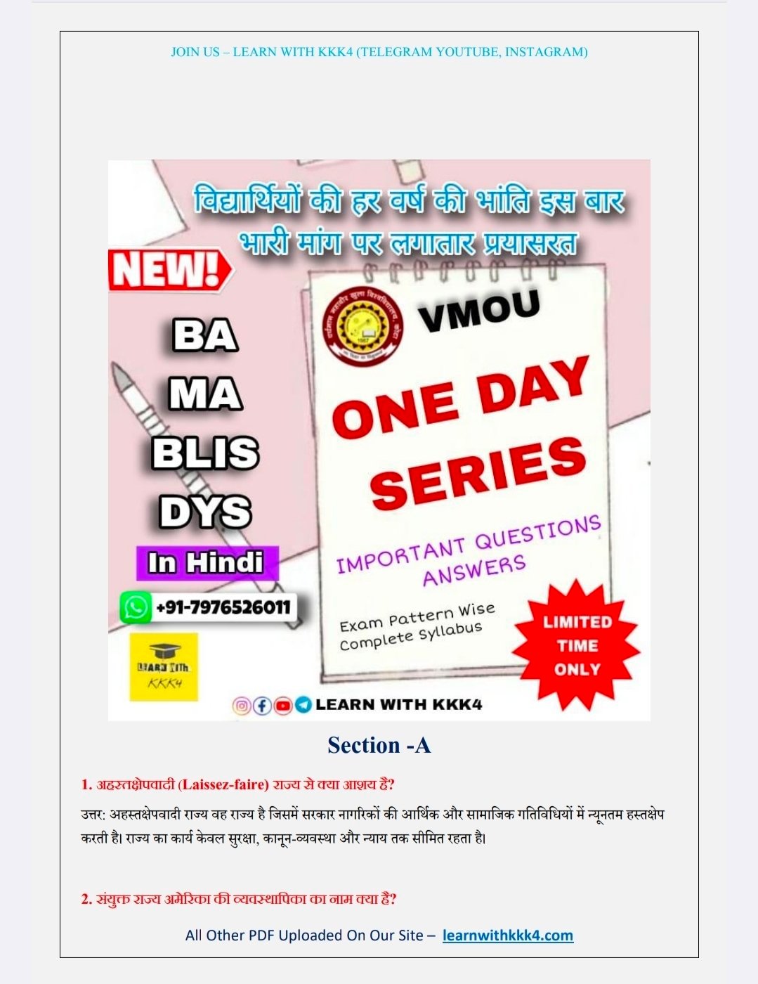 VMOU (Vardhman Mahaveer Open University, Kota) student looking for reliable and effective most important questions for exam paper ? Your search ends here! (LEARN WITH KKK4) presents a comprehensive University one day series PDF specifically designed for VMOU courses. This PDF is the perfect resource to help you excel in your studies and submit top-notch assignments